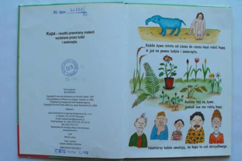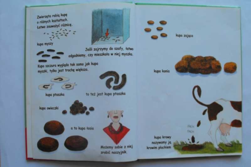 Wydawcy w pogoni za zyskiem zapominają o dobrym smaku, kulturze, dobrych obyczajach. Tych cech nie mają także bibliotekarki, ktore zakupiły tę książkę do biblioteki(jest stempel), a powinny kształtować kulturę czytelniczą, co jest jednym z ich głównych zadań. Nie doczytałam do końca, z powodu wielkiego obrzydzenia. Literatura ma za zadanie rozwijać poczucie estetyki, uczyć wartości, wskazywać wzorce, pobudzać wyobraźnię, dostarczać wiedzy o otaczajacym świecie. Jeżeli ktoś powie, że ta książeczka daje wiedzę o kupie, to ja się pytam, po co komu taka gówniana wiedza?