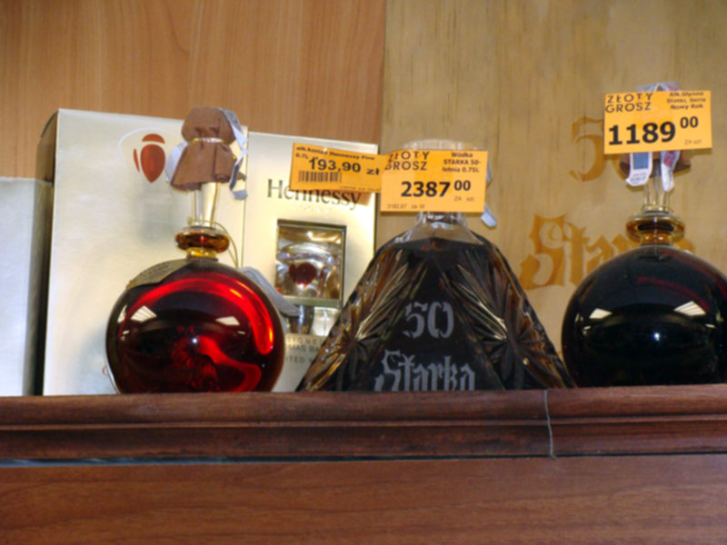W normalnym niezbyt drogim mini markecie "Złoty Grosz". Ta starka stoi na najwyższej półce od 9 lat i jest najdroższym towarem w całym sklepie.