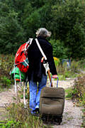 Od jakis 12 lat przyjezdzam regularnie do Düsseldorfu i spotykam tu siedzacego przy sklepie mezczyzne. Na oko ma jakies 55 lat. Caly czas wyglada tak samo - ma te same rzeczy na sobie (skorzane), lekki zarost, ostre ale pogodne rysy twarzy i wiecznie sa przy nim cztery ogromne torby. Wszystkie zapakowane na taki wozek do przewozenia bagazy i obwiazane sznurkiem zeby ich nie pogubic. Kiedy teraz znow przyjechalam idac do miasta prawie przez cala droge myslalam o tym czlowieku. Mialam nadzieje, ze go spotkam. Widzac z daleka znajome torby poczulam ulge a kiedy Go mijalam zapragnelam przywitac sie z nim. Nie patrzyl na mnie. Pisal cos sobie (jak zwykle) drobniutkim maczkiem. Ten wozek, troby i miejsce przy sklepie, to chyba caly Jego swiat. Mysle, ze On jest w nim szczesliwy.