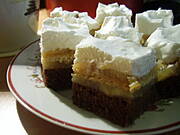 Ja upiekłam ciasto z jabłkami zalewane śmietaną.Robiłam je pierwszy raz i trochę sceptycznie patrzyłam na swoje poczynania mimo,że koleżanki zachwalały że jest bardzo dobre.Jest to kruche ciasto,potem jabłka pokrojone w plastry,piana z białek z cynamonem,znów kruche ciasto i pieczemy.Potem zalewamy śmietaną z cukrem i trzymamy w wyłączonym piekarniku do wystygnięcia.Ja jednak podpiekłam 5 minut.Na przestudzone ciasto ścieramy gorzką czekoladę.Ciasto smakuje znakomicie!!!!Śmietana wsiąkła w to ciasto przez co jest wilgotne.Początkowo córka myślała,że jest to "coś z serem"