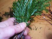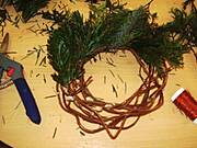Dowiązujesz pęczek zielonego, za każdym razem okręcając nitką. Następnym pęczkiem zakrywasz "szycie" i znów okręcasz. I tak dookoła. A to już gotowy wianuszek. Niesforne gałązki, takie które za bardzo wystają obcinasz nozyczkami.