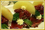 Poledwiczka z musem brokułowym i jajami przepiórczymi,