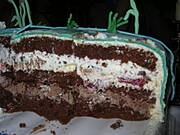 Oj napracowałam się, napracowałam... i nagłówkowałam przy tym co niemiara. Babcia nie jest osobą wylewną ale łzy miała w oczach! Popłakała się moja mama i wogóle goście byli w szoku! A za rok, to chyba się już nic "gorszego" nie da wymyśleć. Biszkopt nie wyrósł tak, jak bym chciała, ale przekroić się na 3 dał, pozatym już po 35 minutach wyglądał na upieczonego(a muszę zawsze dłużej w piekarniku ciasta potrzymać) i to było dla mnie dziwne więc go jeszcze dla pewności potrzymałam i nie był pulchny. Nie mogłam go żyłką przekroić. Mocno więc ponczowałam. Dorotko (jeżeli mogę się tak zwracać) pierwszy raz kładłam masę cukrową na krem budyniowy i przy jedzeniu była bardzo miękka- aż chyba za bardzo, czy Tobie też tak wychodzi? I jeszcze coś mi nie wyszło - a mianowicie na drugi biszkopt połozyłam masę budyniową z wiśniami, na to kremówkę z cytryną z połamanymi bezami (w czwartek w nocy) a tort był jedzony w sobotę.i ani bezów ani kwasku cytryny nie było czuć- wszystko się jakoś przemieszało. a chciałam by słodycz chrupkiej bezy była przełamana kwaskiem kremówki. Czy myślisz, że po prostu za szybko było zrobione? Czy należałyby jakoś inaczej? Jestem jeszcze zupełnie zielona i po prostu próbuję ... Pozdrawiam. (a biszkopt przy pieczeniu pachniał nieziemsko), A tu przekrój na którym nie widać bezy...