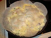 Jak nie ma sie pasujacej pokrywki do patelni albo garnka: zlozyc arkusz papieru do pieczenia na cztery czesci , zmiezyc miej wiecej od srodka srednia i obciac na okraglo nozyczkami, wyciac mala dziure w srodku i polozyc na danie zamiast pokrywki