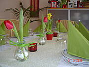 O nie nie! Tak być nie może! Nie ma nikogo w Kawiarence? To ja już zabieram się za robienie tutaj świątecznej rewolucji Ustawiam w różnych miejscach wielkie bukiety z samych tulipanów. Zrobię podział na tradycyjne, czerwone i drugie wiosenne czyli żółte. Stoliki też przejaśniały. Wszędzie rozkładam lniane i bawełniane "bieżniki" w jasnych kolorach (biel, beże i wyrazista zieleń). Na parapetach okien zostawię świece w tych samych kolorach. Teraz jeszcze dzbanki z herbatą, kawą i do tego smaczne dodatki (soki, konfitura, imbir, pomarańcza). Mam nadzieję, że będzie to dla Was miła niespodzianka i już od progu dostrzeżecie te zmiany.