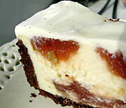 Sernik typu cheesecake, z rabrbarem (część w formie musu, część w malutkich kawałeczkach). Te czarne kropeczki na powierzchni, to ziarenka wanilii
