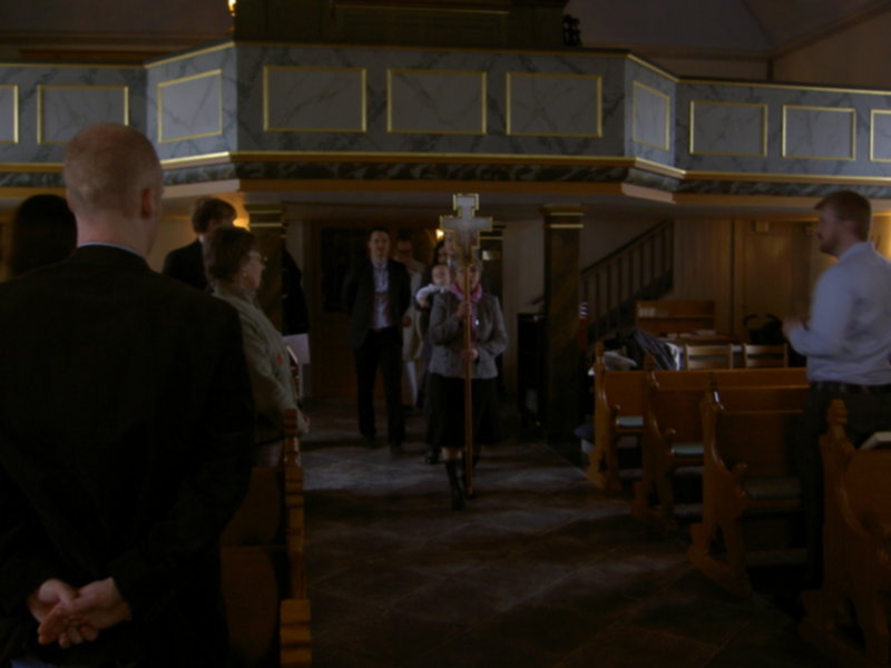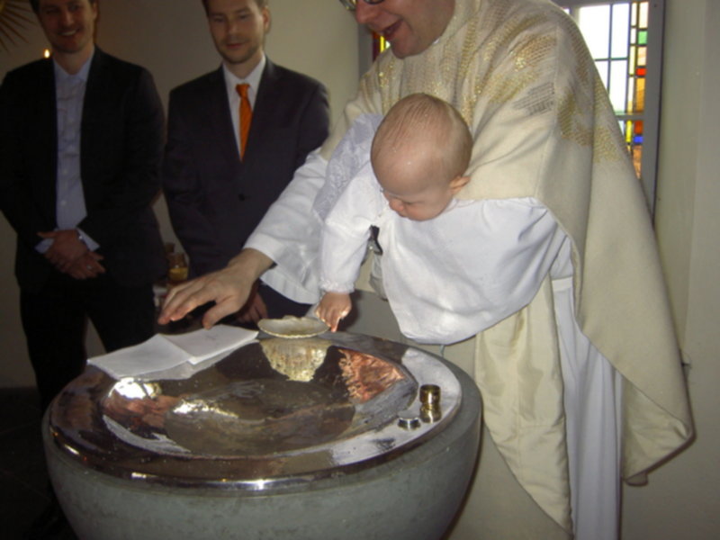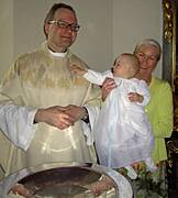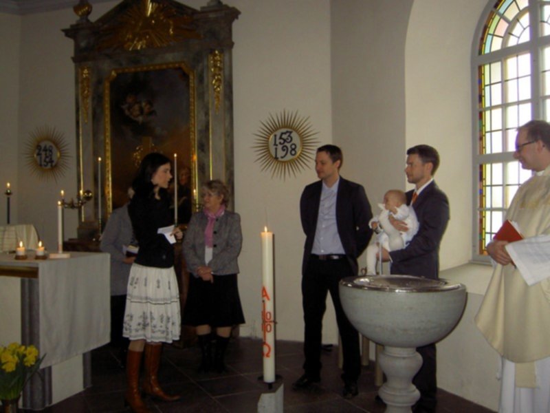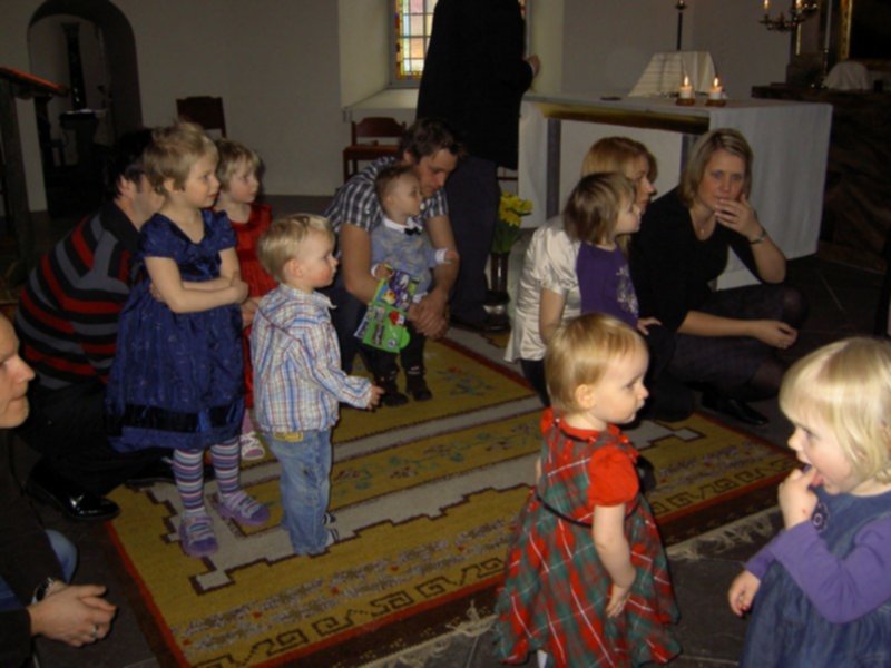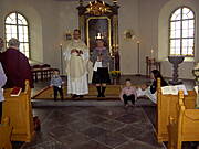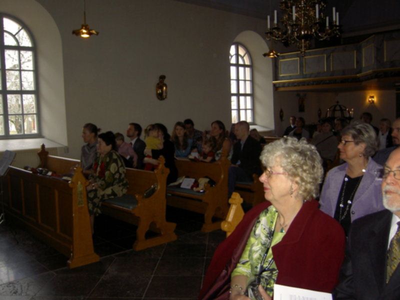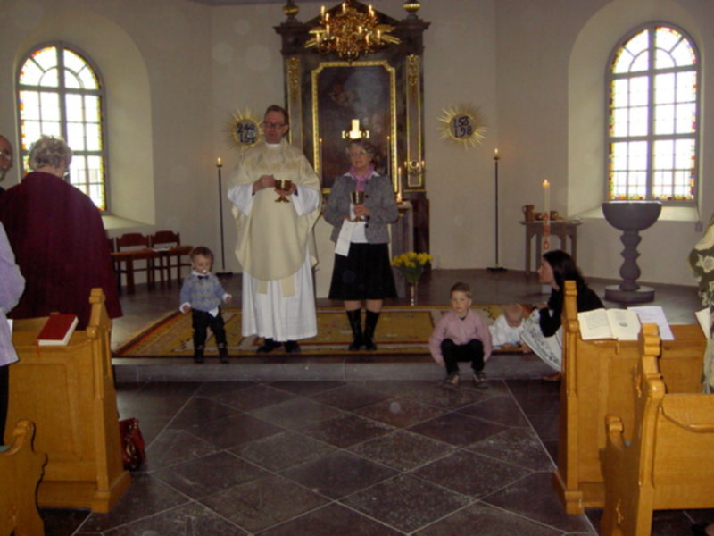 Takiej pieknej, rodzinnej uroczystosci dawno nie przezylam. Ksiadz ten sam co dawal slub rodzicom. W kosciele w czasie calej mszy kompletny luz. Ksiadz zaprosil wszystkie maluchy do oltarza, mogly sobie chodzic, gaworzyc, zadne sztywne siedzenie w lawkach. Nawet przy przyjmowaniu komunii, mogly dzieci platac sie pod nogami. Komunie mogl przyjac kazdy, obojetnie w jakiej wierze byl ochrzczony. W szwedzkim kosciele komunia sklada sie z kawalkow specjalnego "chleba" i czerwonego wina. Bylo po prostu cudownie!