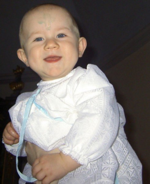 Ha, tutaj chlopcy na niebiesko a dziewczynki na rozowo, ciekawe dlaczego? :)))) Alvinek byl ubrany w "sukienke" swojego tatusia , tutaj jest to tradycja.