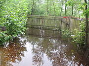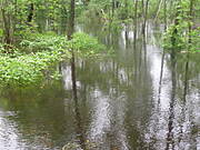 To co widzicie to starorzecze, które normalnie ma 1-1,5 m szerokości.Woda ma głębokość do kostek, jak mokry rok ok 0,5 m ale najczęściej wysycha podczas upałów. Zasilane jest z głównego koryta rzeki, która odsunęła się od zabudowań na ok.1,5 km.W czasie każdego przyboru wód zamienia się w coś takiego z powodu tzw. cofki.W tej chwili mam w głąb podwórka ok. 6m wody, w poziomie nie w pionie:))) Ponieważ zabudowania gospodarcze i dom stoją na lekkim wzniesieniu ,więc mamy nadzieję,że nas nie podtopi , chociaż wody ciągle przybywa ponieważ opróżniają zbiornik retencyjny,więc może być ciekawie.