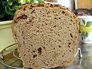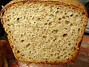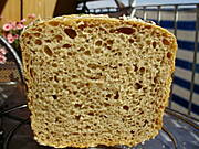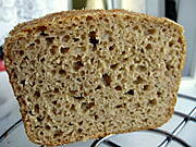 Razowiec, od Tatter. Tylko ja nie trzymam się przepisu ściśle. Wody wcale nie dawałam, tylko zastąpiłam maślanką. Mąki pszennej daję mniej, a żytniej (razowej i chlebowej) więcej. Jest bardzo pyszny i nie wymaga tych całych ceregieli z przekładaniem do koszyka, z koszyka itd. Ciasto jest bardzo luźne, więc spokojnie wyrasta sobie w keksówce. A tu przekrój chlebka. Kroiłam jak był jeszcze ciepły