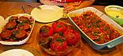 Baklazan, cukinia i papryki nadziewane farszem z miesa i ryzu. Duszone w pomidorach, z cebula - podawane z zimnym sosem jogurtowym z czosnkiem i mieta.