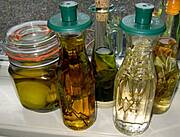 Mam juz zamrozone pudelka z zoltymi malinami, truskawki powoli sie koncza. Dzisiaj zrobilam olej rzepakowy z zimnego tloczenia "virgin" z rozwinietymi kwiatami lawendy i w drugiej butelce bialy ocet winny z kwiatami lawendy. W mala butelke wsadzilam listki bazylii z olejem rzepakowym virgin. Wszystkie butelki, sloiki stoja sobie na parapecie w sloncu i beda "dojrzewac" wiele tygodni:)
