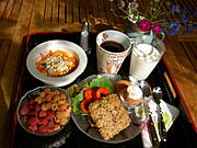 8 godz. 2 kromki ciemnego chleba z żółtym serem, jajecznicą z 2 jajek i czerwoną papryką; kawa pół na pół z mlekiem
