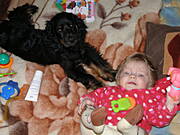 No niestety, z psem a szczególnie z dużym psem wiążą się zawsze jakieś problemy... Kupując zwierzaka mieliśmy tego pełną świadomość. Dzięki Bogu, pies jest oprócz tego ułożony, był łatwy w trenowaniu, bardzo szybko nauczył się reagować na podstawowe komendy typu "przynieś", "siad", "leżeć", "zostań" i tym podobne. Poza tym zdecydowaliśmy się na tą a nie inną rasę ze względu na łagodne podejście do dzieci - mamy jedną córkę a może niebawem będziemy myśleć o następnym dziecku. Nasza sunia jest bardzo towarzyska. Sama długo nie usiedzi, nawet spać przychodzi w to miejsce, w którym ja akurat coś robię. Codziennie po kilka razy domaga się pieszczot. Poniżej dwa zdjęcia Fiony jak miała kilka tygodni i teraz:
