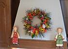 Dziękuję Wam za miłe słowa. Jak go zrobiłam? Podczas spaceru po lesie i łąkach zbierałam rośliny, które wydawało mi się ,że będa pasować do takiego wieńca. Na pewno jest to jarzębina, leśne wrzosy i koszyczki rumianku(?)- to żółte coś. W moim ogrodzie znalazłam dziurawiec ozdobny i gałązki lawendy. Miałam stelaż w postaci kółka z jakichś traw, ale myślę,że równie dobrze sprawdziło by się kółko wiklinowe bądź z pianki. Brałam do ręki po parę gałązek z danego gatunku, przykładałam do kółka i obwijałam mocno bezbarwną żyłką. Musze powiedzieć, że warto nazbierać dużą ilośc roślin- mocowałam je dosyć blisko siebie i szybko się skończyły - w trakcie musiałam pójść je dozbierać:)