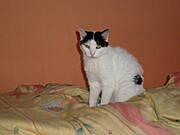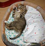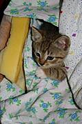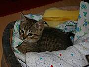 Przyniesli to małe nieszczęście do domu..na chwilę...i tak został. To małe, półdzikie kocie...Starszy niż pisałam początkowo (ma jakieś 8-10 tygodni). Dzika matka nauczyła go juz polować - bo jest szybki i rewelacyjnie przyczaja się, aby atakować papierek na sznurku. Jest bardzo sympatyczny, zwinny, chętny do zabawy, ma lśniące, zdrowe futerko i ogromne oczy. W czwartek idziemy do weterynarza - niech się troche oswoi... U nas jest trzeci dzień kalendarzowy - i jak na tak krótki okres to: Sam załatwia się do kuwety, bawi się chętnie, wzięty na ręce daje sie głaskać, potrafi nawet przysnąć, wyciągnięty z ukrycia jeszcze syczy. I nie lubi głaskania, gdy jest w ruchu - boi się. Zamiast spać w swoi legowisku przeprowadził się do nas do łóżka - pół nocy mąż go wynosił, na koniec kociak był prędzej w wyrku niż pan.. Rano o piątej zarządził pobudkę - najpierw delikatnie łapą po ręce, a na koniec, gdy nie reagowałam - po nosie.