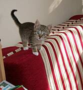 Nie to, że nei chce jeść - bo je - tyle, że strasznie mało - poskubie, poskubie i idzie dalej. Na cały dzień to jest łyżka (stąd myśł o jakimś gotowaniu) - ale myślę, że z dnia na dzień będzie wiecej - bo chyba zrobił się domowy, imię powinniśmy mu zmienić na tornado - bo przez pół wieczora biega i szaleje z piłeczką, kłębkiem, papierkiem na sznurku, pomponem - i niestety moimi firankami