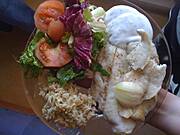 ryba pieczona w rękawie (sól, pieprz, sok z cytryny, połowa cebuli, oliwa z oliwek), mieszanka sałat (z sosem vinegret), brązowy ryż sos czosnkowo koperkowy (4 ząbki czosnku, duzy jogurt Bakoma naturalny, 2 łyżki koperku)