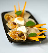 Moje zręczne i pracowite paluszki wykonały dziś ravioli w nadzieniem serowo- dyniowym, okraszone masełkiem ziołowym.