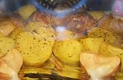 Kurczak pieczony i udziec z indyka (do wyBoru) wraz z ziemniakami i jabłkiem, surówka z marchewki, jabłka i pomarańczy z olejem słonecznikowym. Pychotka. Właśnie się piecze: