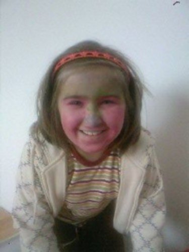 Bardzo dziekuję , to zdjęcie synowa zrobiła dużo wcześniej , wtedy jak moja " mądra wnuczka - na dzień dzisiejszy druga klasa" wymalowała sobie gębusie. Zobaczyła w internecie malowane buzie no i zrobiła sobie makijaż. Kosmetyki matki - cienie do oczu.