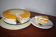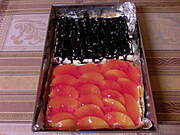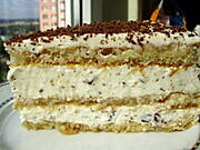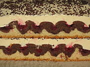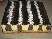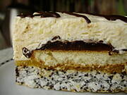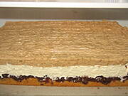 Nie piekłam chyba jakiś miesiąc... Na 1/2 części biszkoptu krem karpatkowy,brzoskwinie i galaretka, a na drugiej również karpatkowy, moczone w amaretto suszone śliwki i na to polewa czekoladowa...