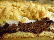 Takiego cudaka upiekłam wczoraj ;). Co wpadło w ręce to lądowało na cieście. I tak dżem z owoców leśnych wymieszany z nutellą, posypany jest orzechami laskowymi i polany budyniem cappuccino