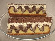 5 jaj /białka ubić 1 margaryna 20 dkg cukru pudru 30 dkg mąki 2 łyżeczki proszku do pieczenia Margarynę ,cukier puder,żółtka zmiksować,do tego dodać mąkę z proszkiem na końcu ubite białka. Podzielić na dwie równe części ,do jednej dodając 4 łyżki mleka i 2 łyżki kakao.Wylać ciasto ciemne na jasne. 1/2 kg jabłek pokroić w plastry.Jabłka ułożyć blisko siebie w cieście na stojąco i upiec. /40 minut 180st./ Krem: