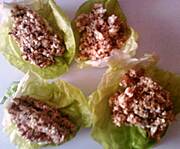 Pasta, twarogowo-rybna, na lisciach sałaty.