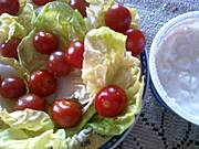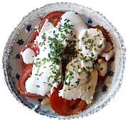 Pomidory, ser a'la mozzarella, z sosem jogurtowo-czosnkowym i szczypiorkiem..mniammm