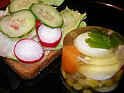 Kromka grahama z sałatą, ogórkiem i rzodkiewką, galareta z kurczaka z dodatkami :)