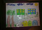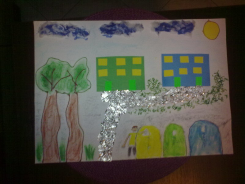 Dzięki waszej pomocy powstał właśnie taki rysunek. Nie wiem czy to widać, ale kontury drzew otoczone są włóczką tak samo kosze na plastik, szkło i papier. Drogę synuś zrobił z folii aluminiowej a wokół jest ryż. Ten ryż to ja kleiłam przyznaje się, niezła zabawa przy tym była cały czas spadał jak tylko klej wysechł. Więc użyłam lakieru do włosów i jakoś się trzyma. Dziękuję za podpowiedź.