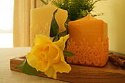 Tak więc dzisiejszy dzionek przeznaczam na zakupy i małe pichcenie. Wczoraj zrobiłam wielkie sprzątanie. Kupiłam w "Biedronce" śliczne, żółte różyczki, które spowodowały, że zachciało mi się przygotować już mieszkanie tak bardziej wielkanocnie. Zrobiłam delikatny stroik. Postawiłam nowe świece. Zmieniłam serwetki. Wszystko jest w kolorach ecru, łososiowo-pomarańczowym, zielonym i oczywiście żółtym (jak słońce!).