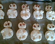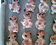 Ciasto: 50 g drożdży, 1 kg mąki, wody ile weźnie cisto, sól, odrobina cukru do zaczynu. Zaczyn, ciasto (konsystencja ciut gęstsza niż na pączki, taka jak na chleb) - rosło 40 min., odgazowałam, napakowałam foremki, spięłam drutem, odstwiłam na 10 -15 min i do piekarnika, 200 st, ok. 1 godziny. I barany są cacy.