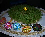 Zrobiona sałatka gyros,jarzynową przywiezie córka.Zaraz robię galaretę drobiowo-warzywną.Gotowanie żurku (właśnie się kisi),jajek i ich faszerowanie jutro,jak również pieczenie białej kiełbasy.Wczoraj-zrobiony chrzan i ćwikła-"własnej produkcji".A,jeszcze jutro,na deser,"mocno owocowa "galaretka.