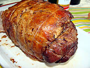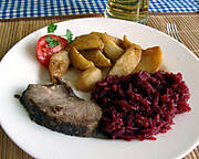 Karkówka macerowana i pieczona (w całości) z ziemniakami. Buraczki zasmażane i piwo.