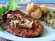 Młode ziemniaki z koperkiem, kotlety schabowe i młoda kapusta gotowana w ćwiartkach polana bułką tartą. Dla mnie bez bułki.