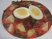 Barszcz czerwony z ziemniakami i jajkiem, ziemniaki z zielona cebulka jajko sadzone oraz buraczki z cebulka.
