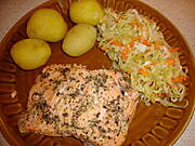 ziemniaki z wody, filet z łososia pieczony w folii , surówka z kiszonej młodej kapustki