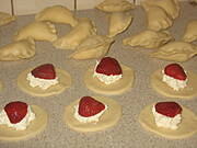 Dzisiaj była imprezka, więc były polędwice marynowane tineczki, roladki z indyka z szynką i marchewką, królik w sosie winno-śmietanowym, ziemniaki, pyzy, fasolka szparagowa, szparagi w sosie maślano-śmietanowym, kapusta młoda duszona, sałata z jajkiem, rzodkiewką i szczypiorkiem w sosie smietanowo-majonezowym, zupa-krem szparagowy; na deser torty: smietankowy z truskawkami i czekoladowy z wiśniami (z cukierni).
