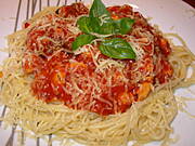 Dziś spagetti z piersią kurczaka i sosem pomidorowym z serem i duuużą ilością świeżej bazylii...