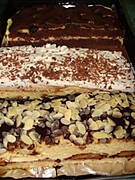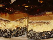 To takie wymyślone przeze mnie ciacho..kurka rurka, jaką dać mu nazwę? Czekam na propozycje. Warstwami: biszkopt makowy, krem ajerkoniakowy, herbatniki w soku pomarańczowym, masa krówkowa o smaku kokosu, biszkopty w wódce!!!, polewa czekoladowa. Aha, na biszkoptach są hetmańskie rodzynki...też topione w wódeczce. Ponoć nie pijam alkoholuMiłego dzionka :)