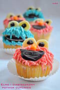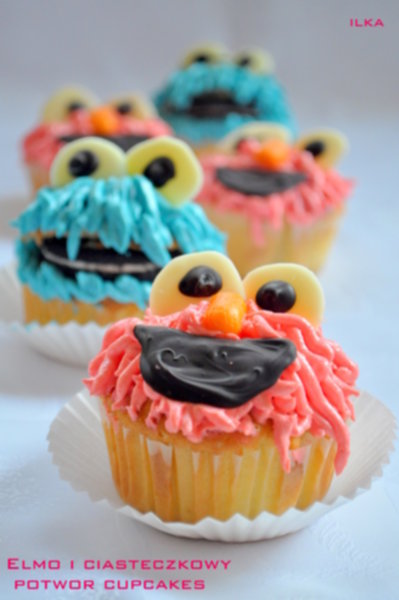 Oczy zrobiłam z białej i gorzkiej czekolady a krem wyciskałam przez tylki jedna z okrągłą końcówką Wiltona nr 5 a druga na potwora nr 352. Nie miałam na celu robic reklamy jeśli tak to proszę usunąć nazwę firmy.