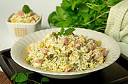 Sałatkę z ryżu, ogórków chilii i eko-parówek wieprzowych