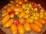 Mój mąż to zapalony ogrodnik i od dwóch lat mamy szklarnie z różnymi odmianami pomidorów. U mnie w domu ta odmiana funkcjonuje jako pomidory bananowe, mają podłużny kształt, pomarańczowy kolor i lekko mączasty miąższ. Nasiona zakupił 2 lata temu chyba na Allegro (ale pewna nie jestem więc zapytam). Jak będzie mąż pod ręką to go wypytam dokładnie o nazwę fachową, bo rzeczywiście w google chyba figurują pod inną nazwą. A to zbiory z mojej szklarni z zeszłego tygodnia. Te pomidorki "bananowe" są na samym przodzie.