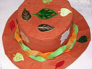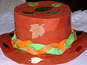 Ja proponuję z kartonu wyciąć duże koło korzystając z dużej miski. Przeciąć od brzegu do środka.Następnie skleić w ten sposób ,żeby powstal stożek. Przymierzyć dla dziecka. Zrobić cztery podłużne otwory. Dwie po jednej stronie i dwie po przeciwnej stronie.Ładną wstążkę odpowiednio przewlec przez te otwory tak, aby można było zawiązac ją pod szyją i żeby dobrze utrzymywała kalelusz na główce. Nazbierać dużo liści i przyklejać je do kapelusza zaczynając od brzegów.Można posługiwać się zszywaczem jeśli się ma.