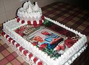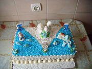 A ja polecam wiórki waflowe, takie z opłatka.Na tym torcie akurat białe i nienbieskie. Kupisz na allegro we wszystkich kolorach. Nie namiękają od kremu, czy bitej śmietany, nie puszczają koloru. Na tym torcie też taśma na boki ale przed krojeniem trzeba ją ściągnąć:)Torty wykonała moja przyjaciółka:)