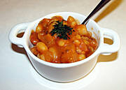 Fasola po bretońsku, pieczywo. Do popicia sok (ja piwo)