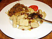 Niestety bez zdjęcia. Kopytka polane smalcem ze skwarkami, cebulą i cząbrem podane z podduszoną i podsmażoną kapustą kiszoną, startą marchewką i cebulą prażoną. To dzieło przypadku wchodzi na stałe do mojego repertuaru!