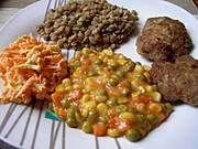 Dziś były kotelty mielone, marchewka z groszkiem i kukurydzą na maśle, surówka z marchewki, jabłka i pora i zielona soczewica. Było pysznie :)